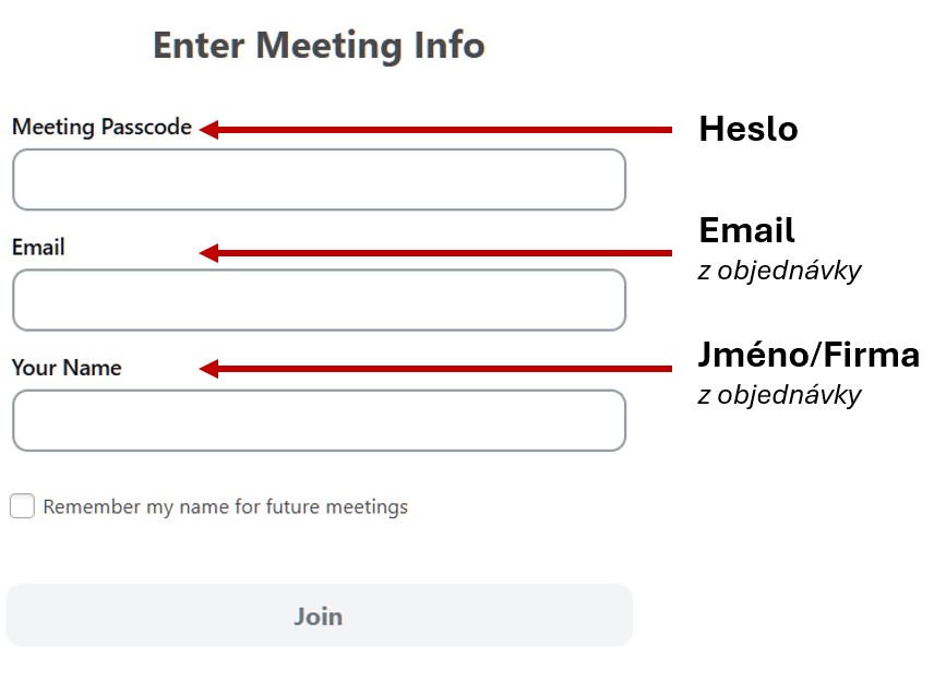 Při přihlašování do Zoom webináře prosím vyplňte v poli „Your Name“ celé Vaše jméno, nebo společnost ze které jste a Emailovou adresu, kterou jste uvedli v objednávce . Usnadní nám to identifikaci Vaší osoby v rámci prezence účastníků. Děkujeme za pochopení.